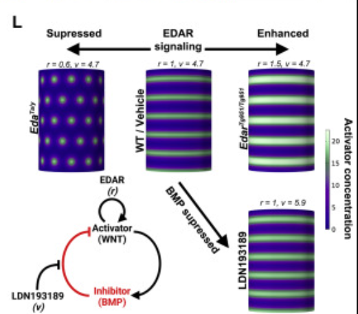 研究人员使用人iPS细胞衍生的胎儿皮肤类器官系统研究了WNT和BMP信号对细胞增殖的影响,他们在类器官上皮细胞中观察到的BMP驱动的WNT反应抑制符合图灵反应扩散系统中抑制剂的要求。接着,他们模拟了一个系统以评估其重建横向脊模式及其实验变化的能力,发现增加EDAR导致形成更厚、间隔更宽的脊纹,而抑制它会导致斑点的产生,而BMP信号的建模抑制加宽了横向脊。因此,在反应扩散系统中起作用的EDAR、WNT和BMP足以解释平行脊模式的产生,高WNT信号用于驱动细胞增殖和形态脊的出现。