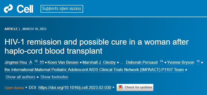 2023年3月17日,美国威尔康奈尔医学院的研究人员在Cell期刊上发表了一篇题为"HIV-1 remission and possible cure in a woman after haplo-cord blood transplant"的研究论文。
