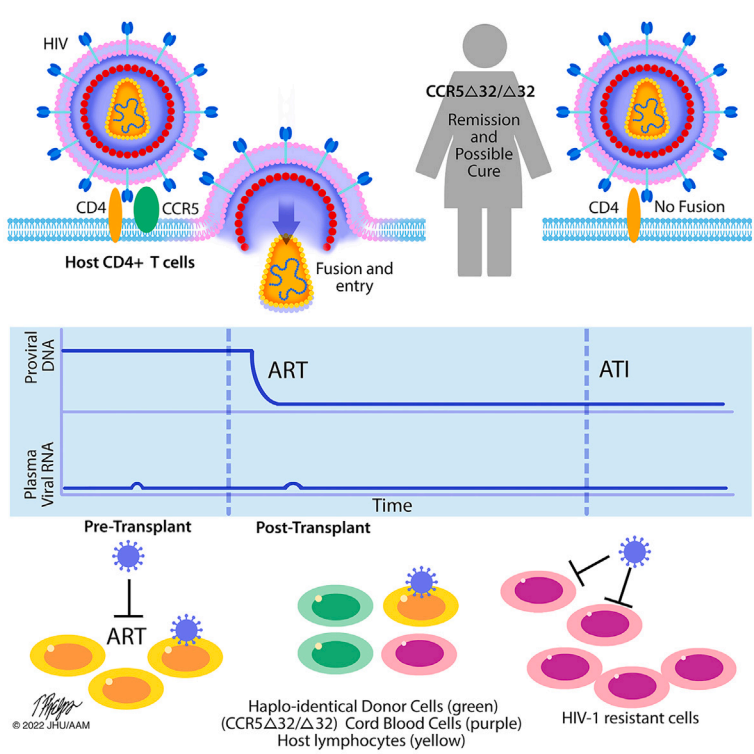 干细胞移植,是一种用于治疗某些癌症的方法,如白血病,通过从供体转移未成熟的血细胞来重新填充受体的骨髓。CCR5是HIV病毒入侵和感染人类细胞的受体,CCR5 Δ32/Δ32 基因突变后,细胞缺乏CCR5受体,HIV病毒也就无法感染。