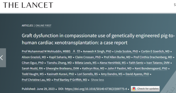 2023年6月29日,马里兰大学Muhammad M Mohiuddin团队在The Lancet在线发表题为“Graft dysfunction in compassionate use of geneticallyengineered pig-to-human cardiac xenotransplantation: a case report ”的研究论文,该研究报告了1例基因工程猪对人异种心脏移植的移植功能障碍,在这项报告中详细介绍了目前对影响异种移植结果的重要因素。