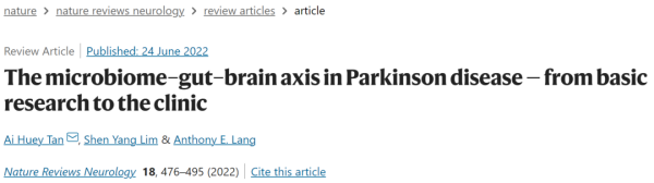 2022年《自然》子刊上发表的一篇综述性文章总结了脑肠轴研究在PD中的研究动向:10年来大量的有关大脑和肠道之间密切双向联系的高质量证据导致了神经病学机制研究的范式转变,各种肠道疾病(包括感染、生态失调、炎症和运动障碍)、肠道干预和饮食因素与帕金森病的发生和进展有关,并且已被证明会影响帕金森病药物的反应。肠道相关因素为生物标志物开发和干预策略提供了多个潜在靶点,用于治疗帕金森病症状的相关靶向性疗法已经开始展现出强大的治疗潜力[8],比如在2022年初,靶向脑肠轴的GV-971获得FDA批准进行2期临床试验,就象征着靶向脑肠轴已经成为PD治疗领域的主流研发方向之一。