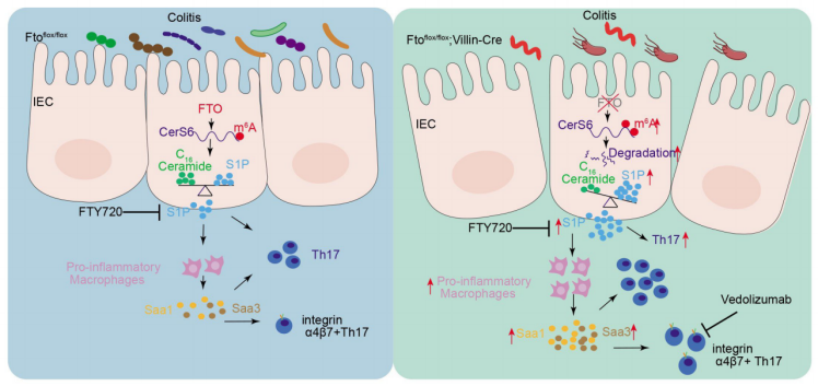 FTO缺乏导致编码神经酰胺合成酶基因CerS6的m6A修饰增加,mRNA稳定性降低,导致CerS6下调,S1P在IECs中积累。随后,IECs分泌S1P触发促炎巨噬细胞分泌血清淀粉样蛋白A蛋白1/3,最终诱导Th17细胞分化。此外,通过生物信息学分析和实验验证,作者发现FTO表达较低的UC患者可能对vedolizumab治疗有更好的反应。总之,FTO下调通过降低CerS6表达促进UC,导致IECs中S1P积累增加,并通过m6A依赖机制加重结肠炎。UC患者较低的FTO表达可能会增强他们对维多单抗治疗的反应。
