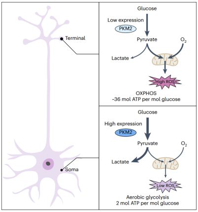 该研究观察到,在基础状态和激活状态下,相对于终末,神经元体表现出有氧糖酵解增加和OXPHOS水平降低。这种差异与躯体中糖酵解酶丙酮酸激酶2(PKM2)的主要定位有关。小鼠中Pkm2的缺失诱导神经元体细胞从有氧糖酵解向OXPHOS转变,导致氧化损伤和多巴胺能神经元的逐渐丧失。该研究更新了传统的观点,即神经元在基础条件下统一使用OXPHOS,并强调了体细胞有氧糖酵解在维持抗氧化能力中的重要作用。