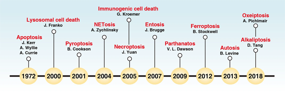 随着人们对细胞死亡的了解与日俱增,最初用于描述细胞死亡的词汇不足以对应已经明确具有不同机制的种种死亡方式,为了解决这一问题,细胞死亡命名委员会(Nomenclature Committee on Cell Death,NCCD)由此成立。2018年,NCCD以分子为导向的方式更新了最新版的细胞死亡分类系统,认定了细胞凋亡(apoptosis)、坏死性凋亡(necroptosis)、细胞焦亡(pyroptosis)、铁死亡(ferroptosis)、自噬依赖性细胞死亡(autophagy-dependent cell death)等十多种术语。然而在同年,又有两种新的细胞死亡方式被发现。
