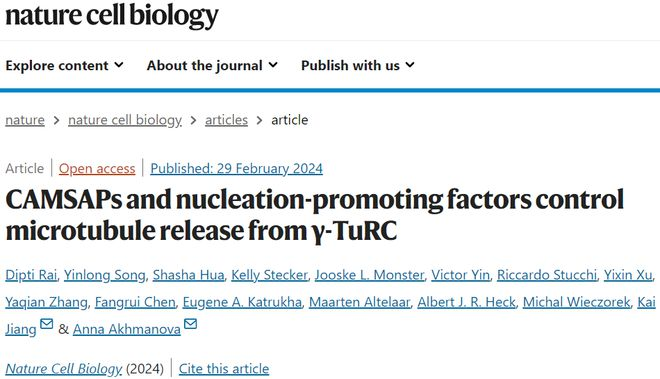 2024年2月29日,武汉大学姜恺及荷兰乌得勒支大学Anna Akhmanova共同通讯在Nature Cell Biology在线发表题为“CAMSAPs and nucleation-promoting factors control microtubule release from γ-TuRC”的研究论文,该研究发现CAMSAPs和成核促进因子控制微管释放γ-TuRC。该研究用纯化的成分在体外重建了这个过程。研究发现所有CAMSAPs都能与γ-TuRC连接的微管的负端结合。CAMSAP2和CAMSAP3修饰和稳定生长负端,而不是负端跟踪蛋白CAMSAP1,诱导微管释放γ-TuRC。