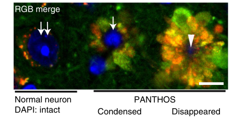 不仅如此,这些自噬溶酶体就像一片片花瓣一样,在细胞核周围互相融合,形成花冠样结构,研究人员称之为PANTHOS(毒花),体内含有毒花的神经细胞又被称为“毒花神经元”。