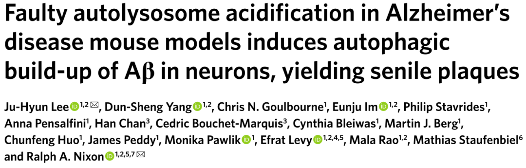 研究以“Faulty autolysosome acidification in Alzheimer’s disease mouse models induces autophagic build-up of Aβ in neurons, yielding senile plaques”为题,于6月2日发表在《自然·神经科学》。