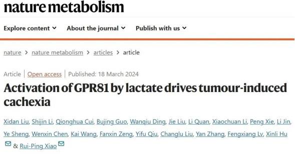 近日,来自北京大学的肖瑞平教授和胡新立教授研究团队在Nature出版集团旗下刊物《Nature Metabolism》发表了题为“Activation of GPR81 by lactate drives tumour-induced cachexia”的研究论文,确定了乳酸对GPR81的慢性激活会引发脂质代谢重编程,而靶向GPR81及其关键信号通路有望对抗癌症恶病质中的代谢损伤,改善恶病质患者的生活质量和寿命。