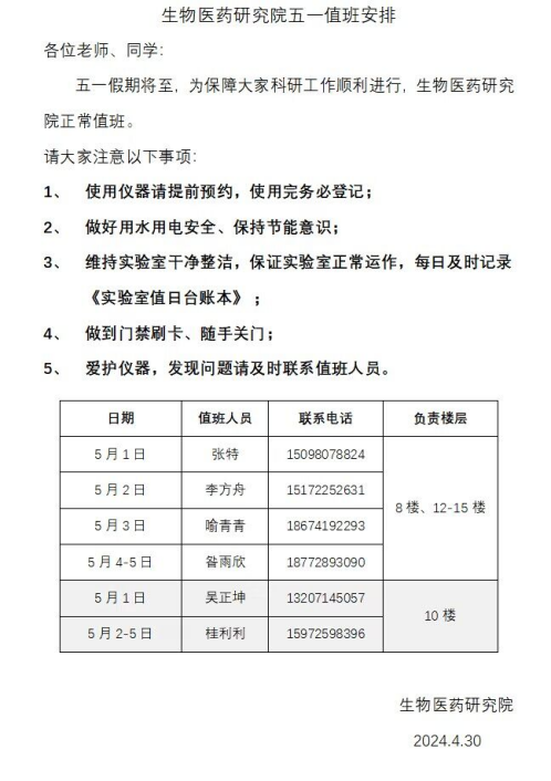 关于生物医药研究院2024年五一值班安排的通知