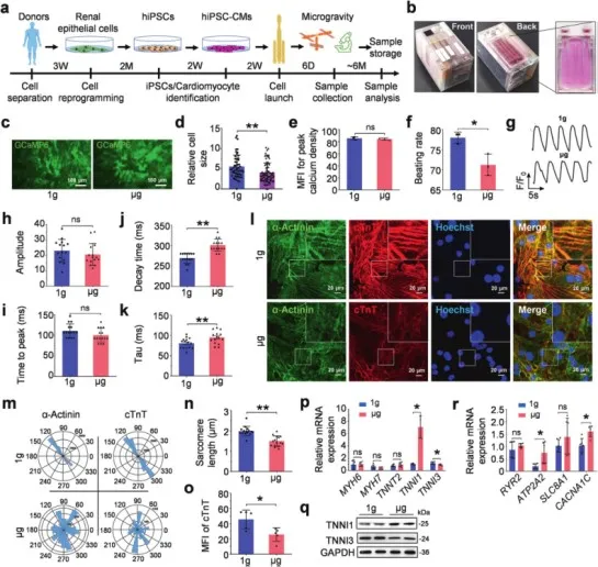 研究结论:太空微重力可导致hPSC-CM中肌节重排和钙循环相关基因的异常表达,从而诱导心肌细胞收缩性改变。