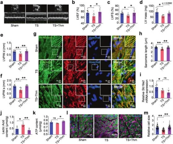 研究结论:硫胺素干预可以显著逆转心脏萎缩表型并改善心脏收缩和舒张功能,补充硫胺素可以保护心脏免受TS引起的心肌细胞结构和功能改变。