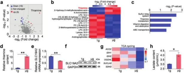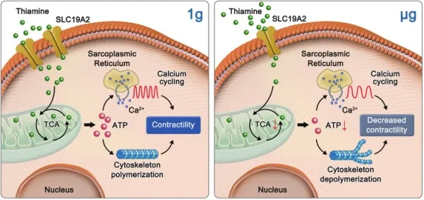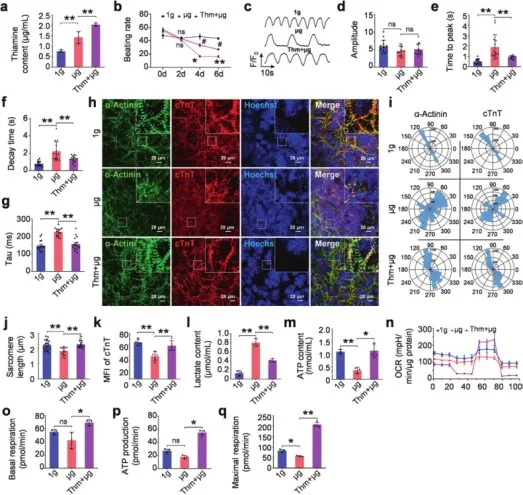 这项研究中,受太空微重力作用下的hPSC-CM出现跳动速率下降和胞内钙循环异常。研究人员通过代谢组学和转录组学分析,揭示了航天中hPSC-CM的一系列代谢重编程,尤其是硫胺素代谢。微重力阻止了hPSC-CM中硫胺素的摄入,使其利用率下降并影响了三羧酸循环,它减少了ATP的产生,从而导致hPSC-CM中的细胞骨架重塑和钙稳态失衡。更重要的是,体内外研究表明,补充硫胺素可以逆转模拟微重力引起的适应性变化。