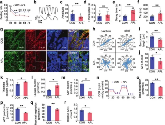 (1)硫胺素类似物氨丙啉(APL,可阻断硫胺素转运)诱导GCaMP-CM中硫胺素缺乏后,检测其类似表型、细胞骨架等,以及细胞培养上清液中残留硫胺素和乳酸含量。
