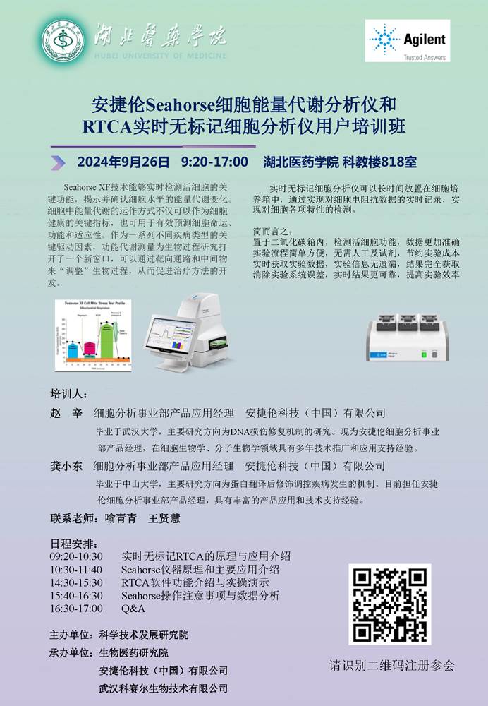 关于湖北医药学院生物医药研究院安捷伦Seahorse细胞能量代谢分析仪和RTCA实时无标记细胞分析仪培训的通知