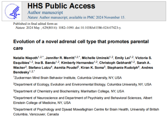 参考文献:Niepoth N, Merritt JR, Uminski M, et al. Evolution of a novel adrenal cell type that promotes parental care. Nature. 2024 May;629(8014):1082-1090.