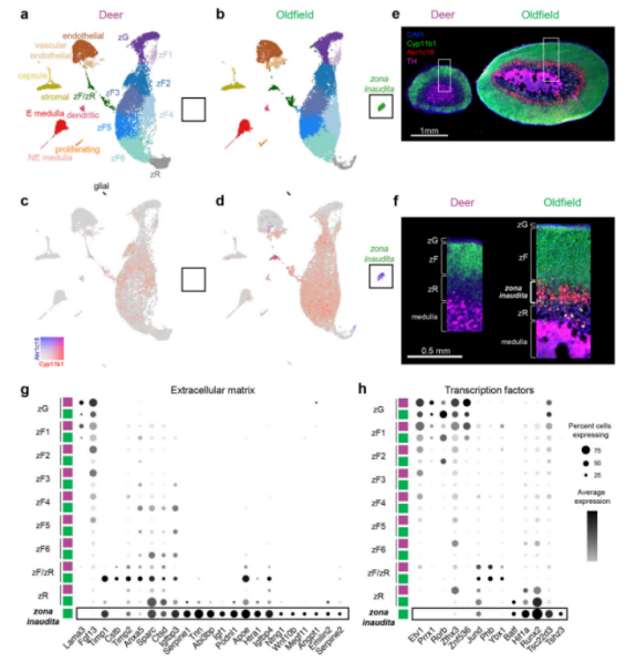 最后,研究人员在细胞水平上探究一夫一妻制小鼠中20α-OHP的进化,单核RNA测序结果发现,除了三种经典的类固醇生成细胞类型外,还鉴定出新的细胞类型:Zona inaudita,其标记物是Akr1c18,位于肾上腺皮质的zF和zR之间,形成一个新的层,该细胞所在区域富含细胞外基质(ECM)相关基因,如tenascin N(Tnn)。