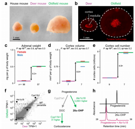今年上半年,来自哥伦比亚大学朱克曼研究所的研究团队在《自然》(Nature)上发表了一篇题为“Evolution of a novel adrenal cell type that promotes parental care”的研究论文。通过对两种白足鼠属姐妹物种——灰背鹿鼠和多偶制的鹿鼠(P. maniculatus)的肾上腺进行深入分析,他们发现,“一夫一妻制”的灰背鹿鼠在肾上腺中进化出一种新型细胞类型,能够将孕酮转化为20α-羟基孕酮(20α-OHP)!这表明,某些物种的父母之所以能展现出强烈的育儿意愿,并非仅仅出于本能或社会习惯,而是有其深刻的生理原因。