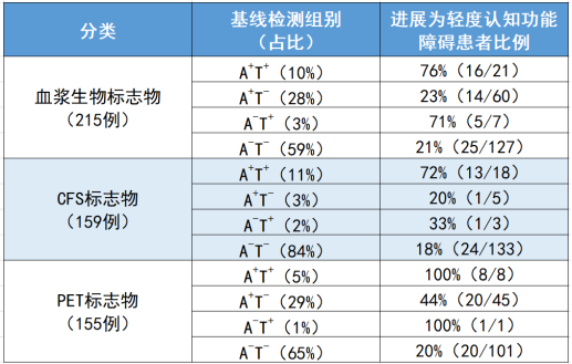 相比于A-T-组(20%)和A+T-组(44%),A+T+组参与者发展为轻度认知功能障碍的比例更高(100%),P<0.005;