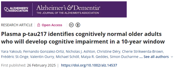 [1]Yakoub Y, Gonzalez-Ortiz F, Ashton NJ, et al. Plasma p-tau217 identifies cognitively normal older adults who will develop cognitive impairment in a 10-year window. Alzheimers Dement. 2025 Feb;21(2):e14537. doi: 10.1002/alz.14537.