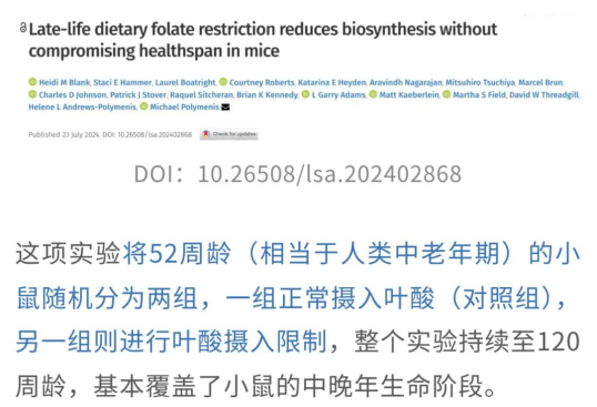 然而,发表于Life Science Alliance的一项研究[4]给出了颠覆性的发现:在老年阶段减少叶酸的摄入,不仅不会带来明显副作用,反而可能改善代谢、延缓衰老、延长健康寿命。