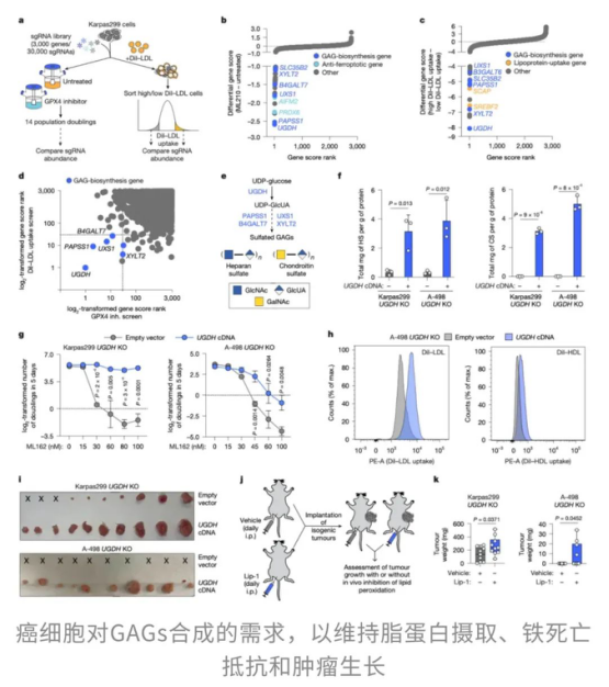 为验证这一机制,研究者进一步敲除了多种癌细胞中的UGDH,结果一目了然:GAGs水平大幅下降,LDL和HDL摄取能力明显减弱,细胞也变得更加容易发生铁死亡。
