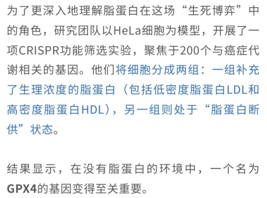 这个号称“铁死亡终结者”的酶,负责清除细胞内的脂质过氧化物,是细胞抵御铁死亡的最后一道防线。而一旦有脂蛋白加入,GPX4的重要性却显著下降。也就是说,在脂蛋白的参与下,癌细胞似乎可以摆脱对GPX4的依赖——这让人不禁好奇:脂蛋白是否隐藏着某种“神秘力量”,能在关键时刻“接管”GPX4的抗铁死亡任务?