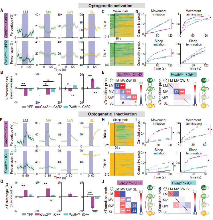 在通过光遗传学技术精准地“打开”这些GAD2神经元后,研究人员惊讶地发现:小鼠会立刻停止所有动作,并快速入睡。反过来,当这些神经元被关闭时,小鼠的活动量显著上升,睡眠时间明显减少,仿佛失去了控制“静止”的能力。这表明,GAD2神经元就像一组“生物刹车片”,一旦启动,就能让身体运动行为减少,并最终进入睡眠状态。