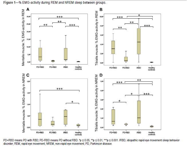 RBD患者(不论是否合并帕金森病)在REM睡眠期间表现出异常增高的肌肉活动,这与正常人在REM期应有的“肌张力抑制”机制相反。