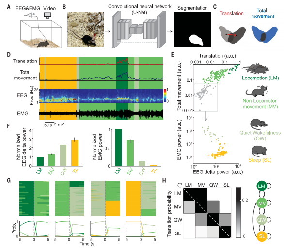 研究人员以小鼠为实验对象,利用深度学习算法对小鼠在笼内的行为进行图像分割和自动化追踪。通过分析脑电图(EEG)、肌电图(EMG)以及视频记录,他们精准识别出四种不同脑觉醒与运动活跃程度的状态,分别为:运动(LM)、非运动性活动(MV,包括进食、梳理毛发和姿势调整等)、安静清醒(QW)以及睡眠(SL,包含 REM 和非 REM 睡眠)。同时,研究者还运用光遗传学技术,利用激光脉冲激活或抑制特定神经元,观察小鼠的行为变化,并结合神经投射追踪技术,描绘出了SNr 内不同神经元群体的神经连接图谱。