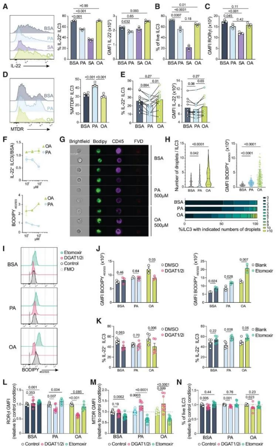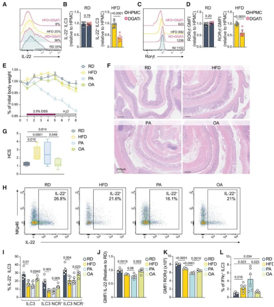 研究采用C57BL/6小鼠模型,分为常规饮食(RD)组和HFD组,喂养7天后进行多组学分析。研究员通过单细胞测序(scRNA-seq)、CITE-seq、流式细胞术等方法分析肠道免疫细胞变化,如ILC3的转录组特征、IL-22分泌能力及脂滴形成等;通过肠道通透性(UssingChamber)、肠跨上皮电阻(TER)等评估屏障功能;通过脂质组学分析小肠及结肠区域脂肪酸组成,肠道菌群16SrRNA测序比较不同饮食模式下肠菌组成及代谢通路变化;并且检测了饱和脂肪酸(如棕榈酸)与不饱和脂肪酸(如油酸)对其IL-22功能的影响,利用DGAT酶抑制剂等手段进行验证;最后,建立无菌小鼠、抗生素处理小鼠及急性结肠炎(DSS诱导)模型,观察饮食干预对炎症恢复的影响。