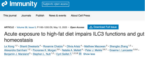 [1]Xiong L, Diwakarla S, Chatzis R, Artaiz O, Macowan M, Zhang S, Garnham A, Morgan PK, Mellett NA, Meikle PJ, Lancaster GI, Marsland BJ, Nutt SL, Seillet C. Acute exposure to high-fat diet impairs ILC3 functions and gut homeostasis. Immunity. 2025 May 13;58(5):1185-1200.e8. doi: 10.1016/j.immuni.2025.03.017. Epub 2025 Apr 14. PMID: 40233759.