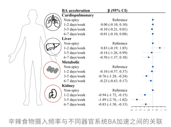不过,代谢和肾脏在每周吃辣6–7天时,效果反而略有下降,这暗示了一种“剂量—反应”关系:适度摄入可能更有益,而天天无辣不欢可能让部分作用被抵消。相比之下,心肺和肝脏的BA变化较平淡,吃辣的作用在这些系统中并不明显。