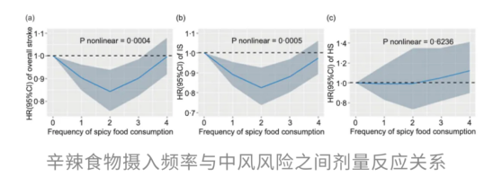 来自广西医科大学等团队的一项研究[3]在中国南方人群中进行了探索,该研究发表于British Journal of Nutrition。研究显示,辛辣食物摄入与缺血性中风风险呈负相关,并呈现U型剂量–反应关系——每周食用3–5天的人群中风风险最低。