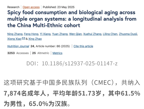 参考资料:[1]Zhang, N., Hong, F., Xiang, Y.et al.Spicy food consumption and biological aging across multiple organ systems: a longitudinal analysis from the China Multi-Ethnic cohort.Nutr J24, 86 (2025). https://doi.org/10.1186/s12937-025-01147-z