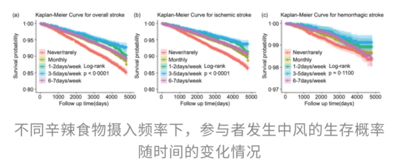 随着时间延长,从不吃辣的人群累积的无中风生存概率最低,每月吃辣、每周6–7天吃辣和每周1–2天吃辣的人群依次更高,而每周3–5天吃辣的人群生存概率最高。这一趋势在缺血性中风中同样显著,但在出血性中风中未见差异。