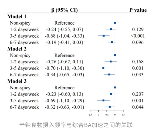 结果显示,相比几乎不吃辣的人,经常吃辣的人在随访时的整体BA加速更低,也就是说,他们的身体机能似乎比同龄人慢了一点“衰老的脚步”。