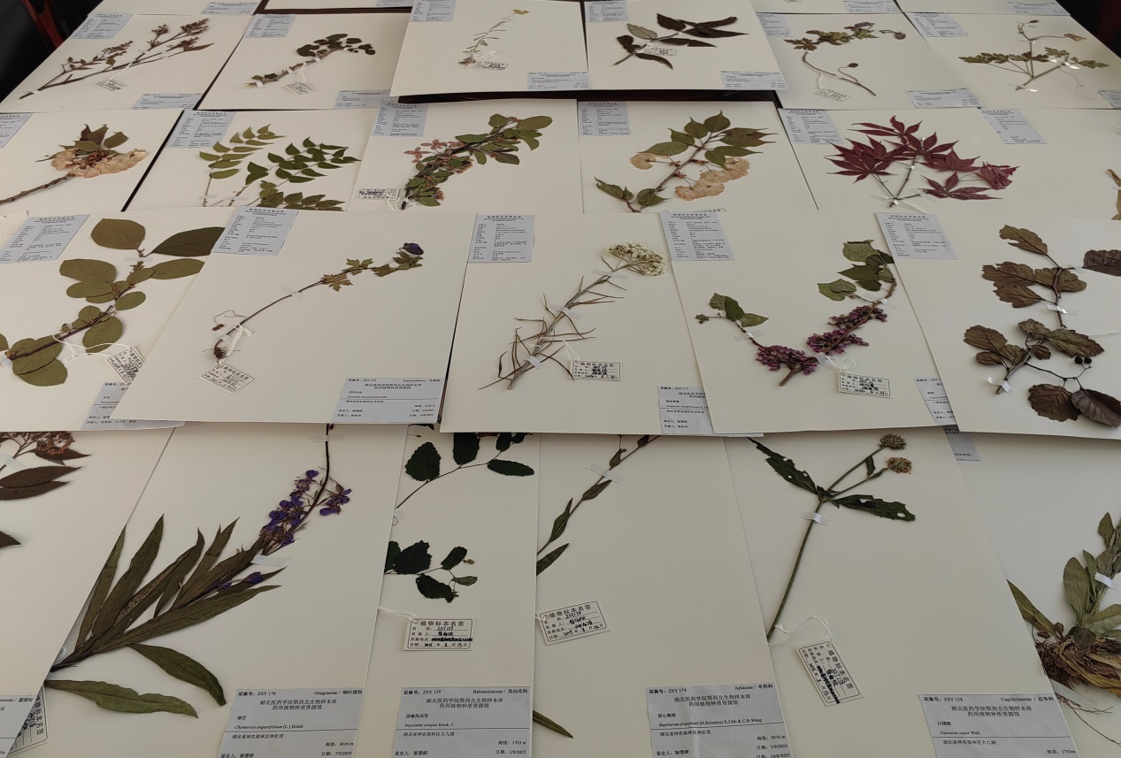 本次制作的药用植物标本均由邹思妍博士于2025年深入神农架、武当山、郧西县及十堰市区等地实地采集,种类丰富、来源清晰,具有重要的科研与保存价值。活动中,全体人员分工协作,将预先压制干燥的药用植物标本精心粘贴至台纸上,并逐一附上对应的采集签和鉴定签,确保每一份标本信息准确、规范完整。经过一天的共同努力,共完成201种、670份药用植物腊叶标本的制作。这些标本将系统纳入鄂西北生物样本库药用植物种质资源馆,为该地区药用植物种质资源的保存、研究与可持续利用提供重要实物和数据支撑。