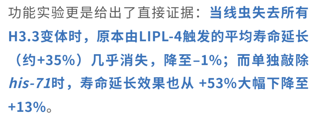 这说明,H3.3变体HIS-71是溶酶体脂解与长寿之间的核心纽带,没有它,延寿效应就难以实现。