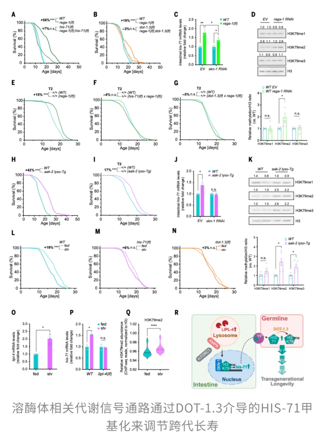 而且在自然条件下,这一机制也会被“饥饿”激活——当线虫在幼虫期经历6天的饥饿后,它们成年后的寿命平均延长19%。如果his-71或dot-1.3缺失,这种“饥饿加成”立刻消失。可见,饥饿本身就是触发LIPL-4表达、“点燃”HIS-71和H3K79甲基化的天然信号。