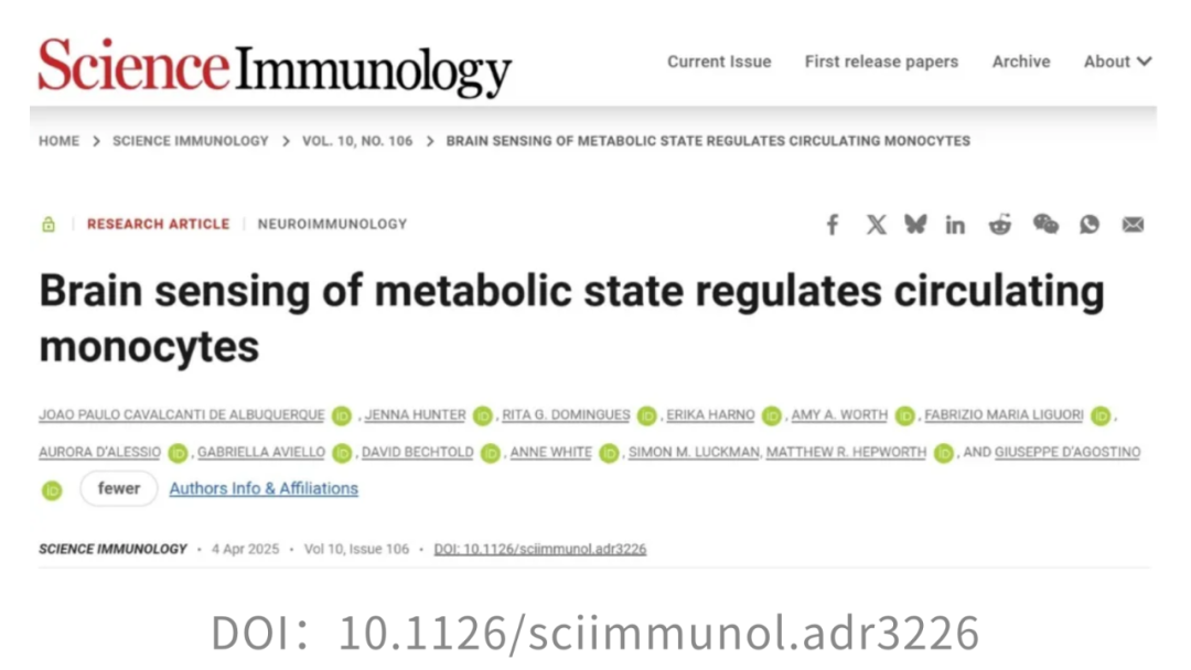 [2]Cavalcanti de Albuquerque JP, Hunter J, Domingues RG, Harno E, Worth AA, Liguori FM, D'Alessio A, Aviello G, Bechtold D, White A, Luckman SM, Hepworth MR, D'Agostino G. Brain sensing of metabolic state regulates circulating monocytes. Sci Immunol. 2025 Apr 4;10(106):eadr3226. doi: 10.1126/sciimmunol.adr3226. Epub 2025 Apr 4. PMID: 40184437.