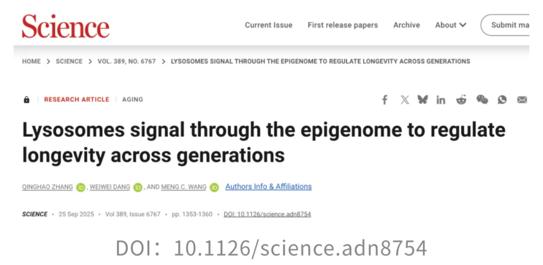 [1]Qinghao Zhang et al. ,Lysosomes signal through the epigenome to regulatelongevity across generations.Science389,1353-1360(2025).DOI:10.1126/science.adn8754