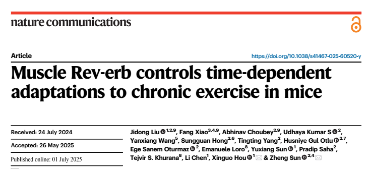 [1]Liu J, Xiao F, Choubey A, Kumar S U, Wang Y, Hong S, Yang T, Otlu HG, Oturmaz ES, Loro E, Sun Y, Saha P, Khurana TS, Chen L, Hou X, Sun Z. Muscle Rev-erb controls time-dependent adaptations to chronic exercise in mice. Nat Commun. 2025 Jul 1;16(1):5708. doi: 10.1038/s41467-025-60520-y. PMID: 40593528; PMCID: PMC12216418.
