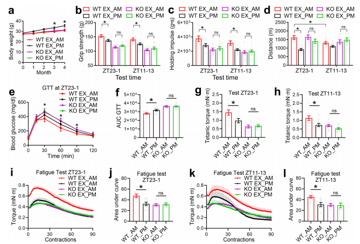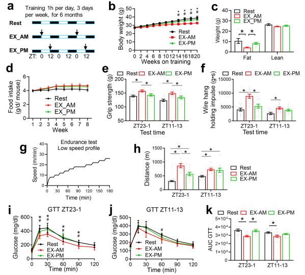 经过长达5-6个月的持续干预,结果呈现出清晰而有趣的模式。在体重控制方面,“晨练组”的小鼠表现出显著优势,其体重增长速度和体脂累积程度均低于“夜练组”。更引人注目的是在代谢健康层面,如下图i-k所示的葡萄糖耐受性测试结果,“晨练组”小鼠的血糖调控能力得到了显著提升,且这一改善在不同时间点的测试中均保持一致。