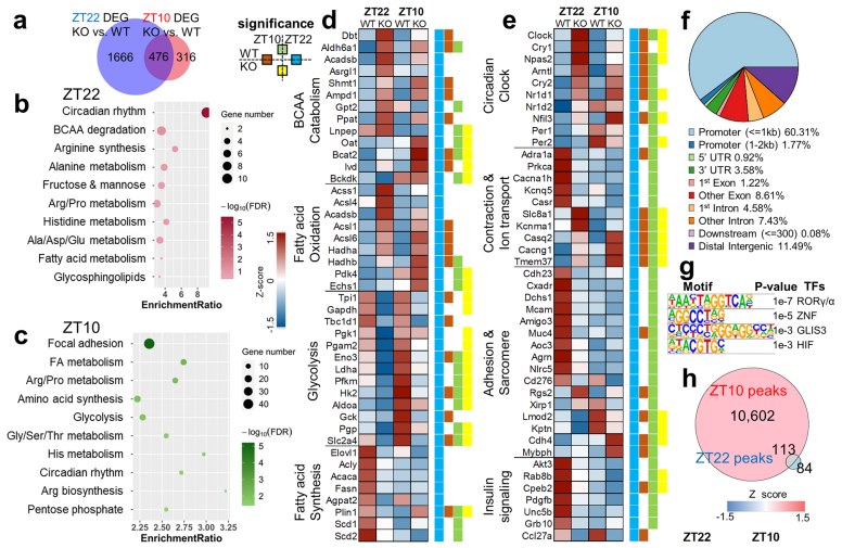 进一步,为了揭开Rev-erb的工作机制,研究人员使用了多组学联合分析技术。转录组测序(RNA-seq)揭示,Rev-erb的功能具有明显的昼夜节律性,其影响在睡眠周期开始前(ZT22)最为显著。如下图b-d所示,在此时段,敲除Rev-erb的小鼠,其脂肪酸氧化和支链氨基酸分解代谢相关的基因表达开始上调,而糖酵解途径的基因则被抑制。