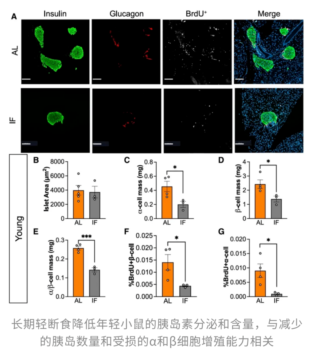 究竟为什么会出现这种差异呢?研究人员分析指出,长期进行轻断食,看上去似乎能让身体“休养生息”, 但在年轻小鼠身上,它会抑制胰岛中α细胞和β细胞的增殖,使这些细胞难以正常成熟。同时,与胰岛素分泌相关的基因(如Mafa和Nkx6-1)表达水平也明显下降。随着这种影响逐渐累积,原本健康的β细胞开始失去分泌胰岛素的能力,最终出现了类似1型糖尿病的功能障碍。