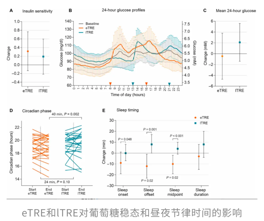 相应地,睡眠时间也跟着“入乡随俗”了。lTRE组参与者整体睡眠节奏都往后挪了一截,睡眠时间中点推迟了约15分钟,成了“晚睡晚起星人”。相比之下,eTRE组参与者睡眠结束和中点都略提前,仿佛身体跟着早吃模式提前开工。