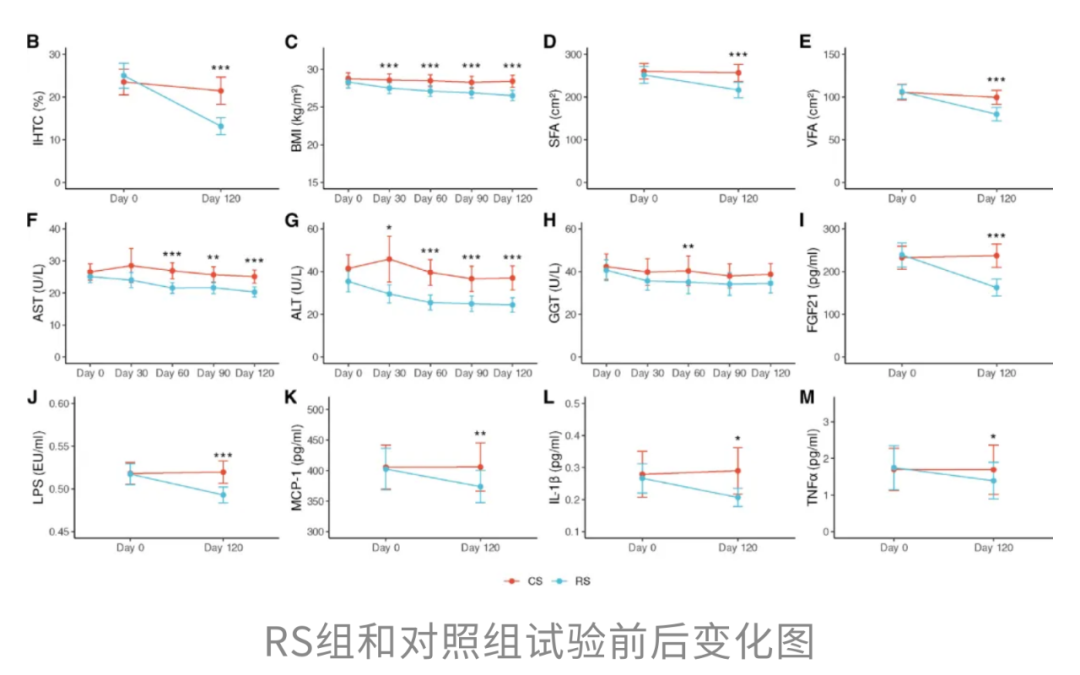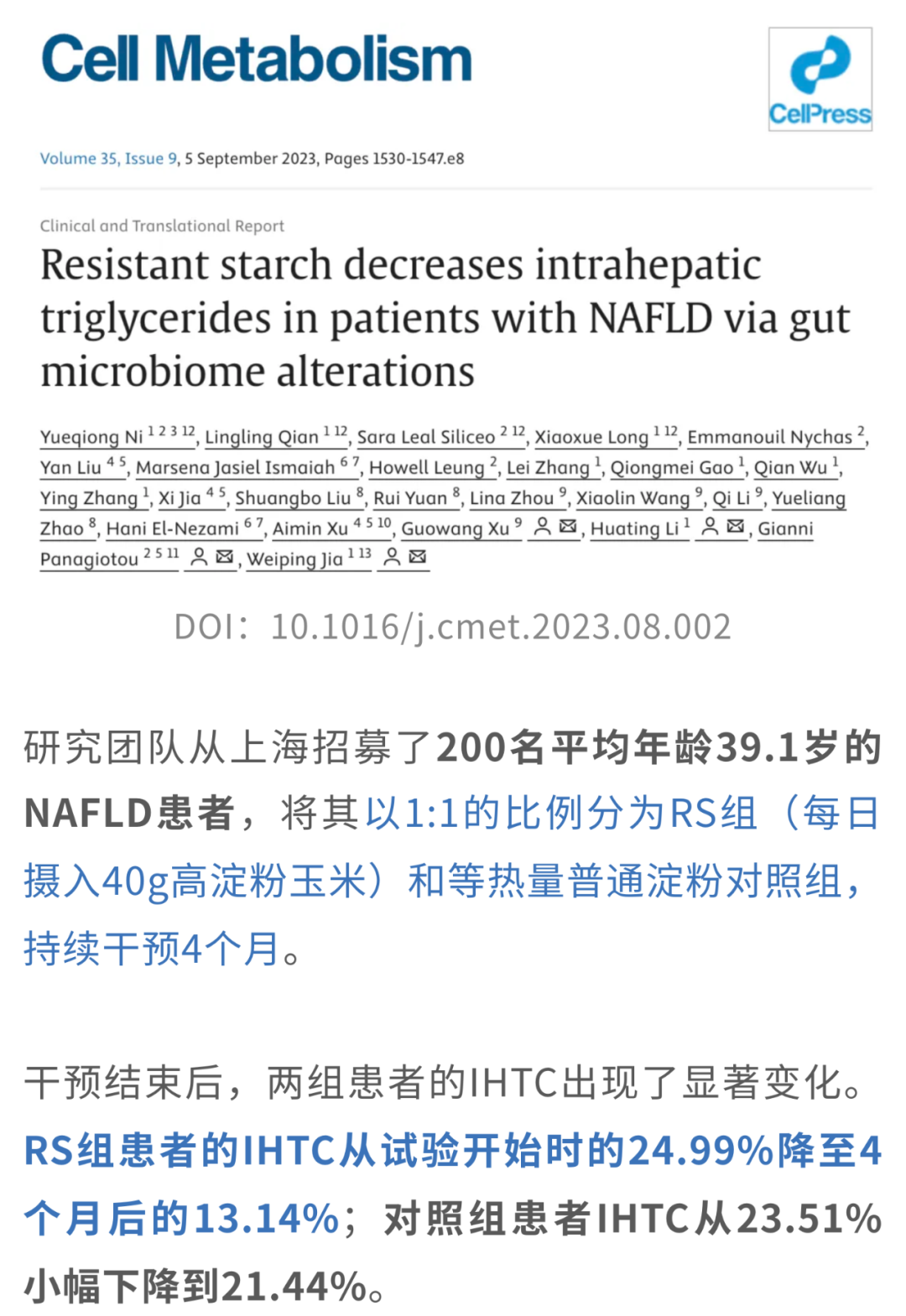 事实上,对RS改善脂肪肝的探索早已开始。此前,来自上海交通大学的研究团队另一项发表于Cell Metabolism的研究[2]就发现,膳食补充RS能通过改变肠道菌群的组成和功能,尤其是粪便拟杆菌(Bacteroides stercoris),来降低非酒精性脂肪性肝病(NAFLD)患者的IHTC,从而改善脂肪肝