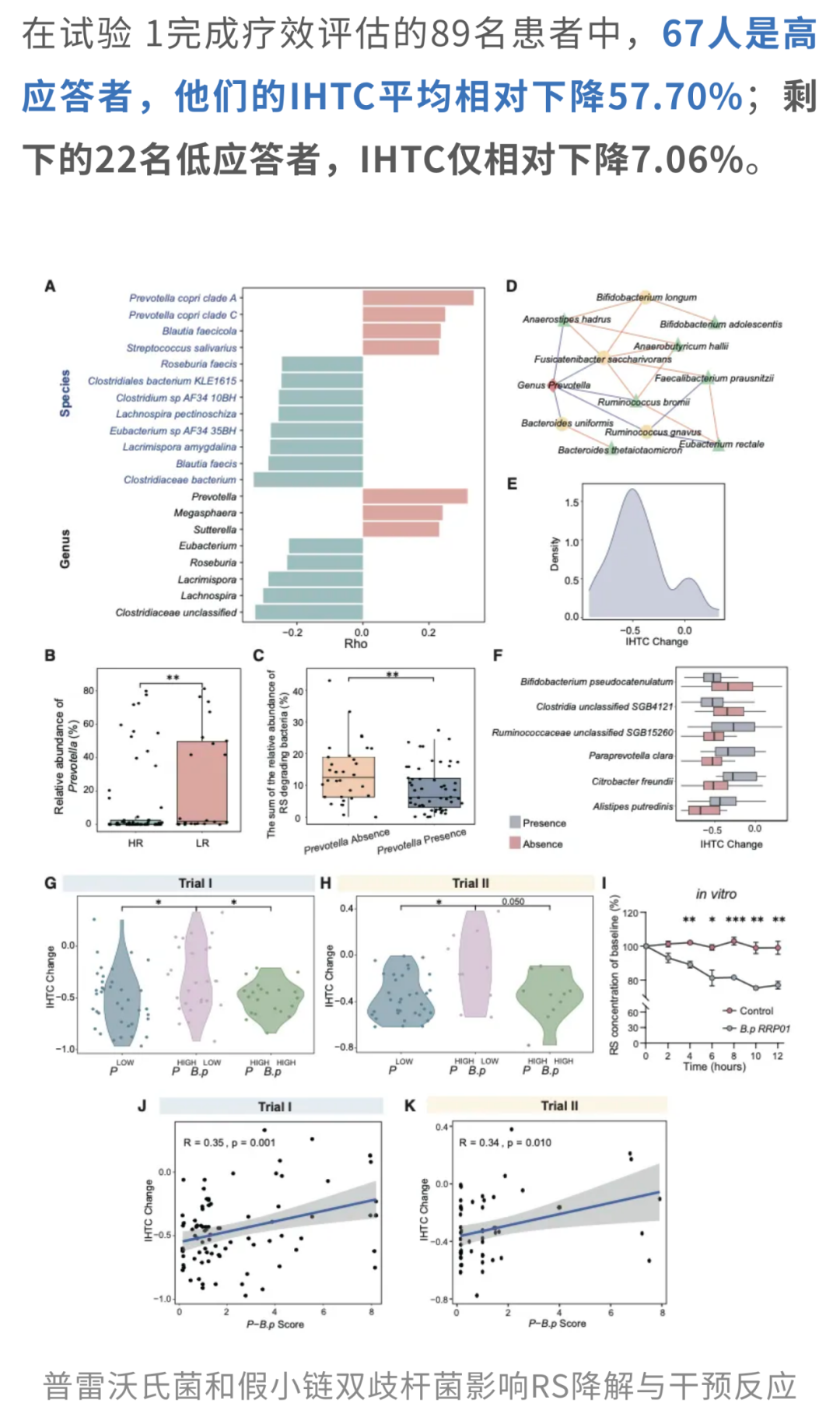 肠道菌群中要说最能「呼风唤雨」的当属普雷沃氏菌假小链双歧杆菌普雷沃氏菌越多,IHTC的相对降幅往往越小,这一现象在试验1和试验2中都得到了验证。而且,这种菌是肠道中当之无愧的「恶霸」,它们会抑制其他能够降解RS的「有益菌」RS无法被有效分解利用,益处自然大打折扣。