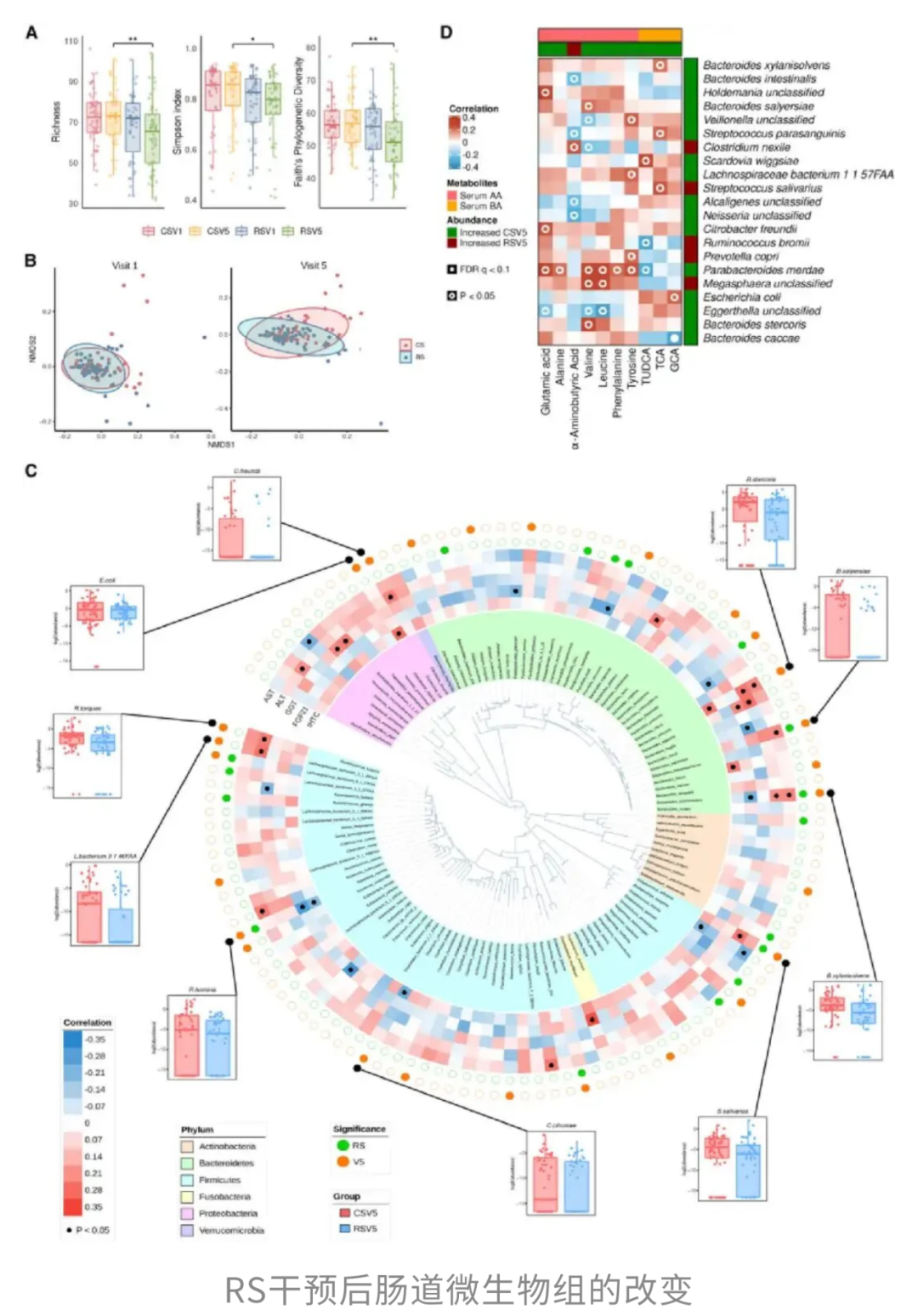 显然,还是因为肠道菌群的变化。研究团队从血清与粪便代谢组下手,追踪了干预前后的动态变化。他们发现,RS不仅改变了肠道微生物代谢产物,还影响了机体可用氨基酸库,尤其是三大支链氨基酸(BCAA,包括缬氨酸、亮氨酸和异亮氨酸)的血清水平,整体方向从「促进脂肪积累」转向「有利肝脏代谢修复」