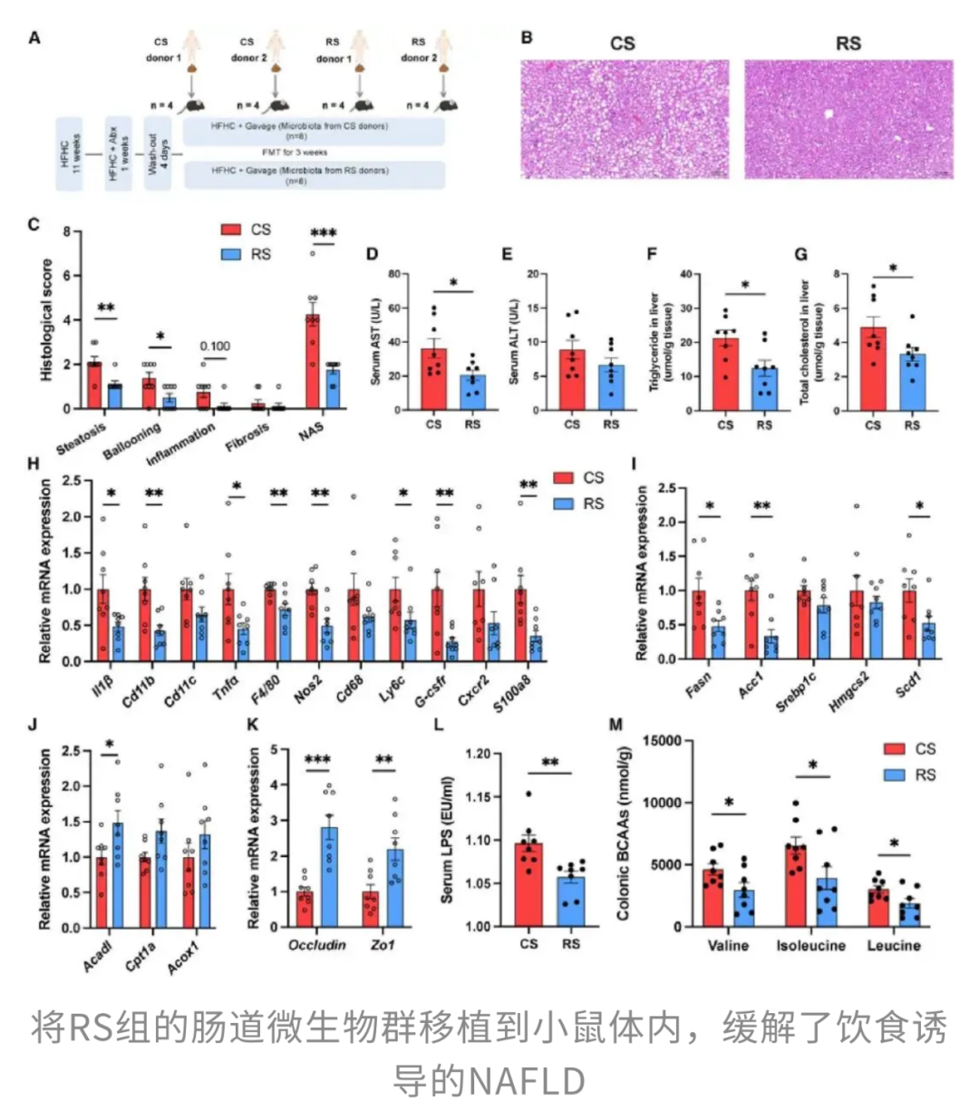 结果不出意外,接受RS组肠道微生物的小鼠,体重和肝脏重量双双下降;NAFLD标志物FGF21显著回落;葡萄糖代谢水平转好,尤其是胰岛素敏感性明显提升。原本因高脂肪、高胆固醇饮食导致的肝脂肪积聚与炎症反应大幅缓解,甚至连结肠中的BCAA水平也明显降低